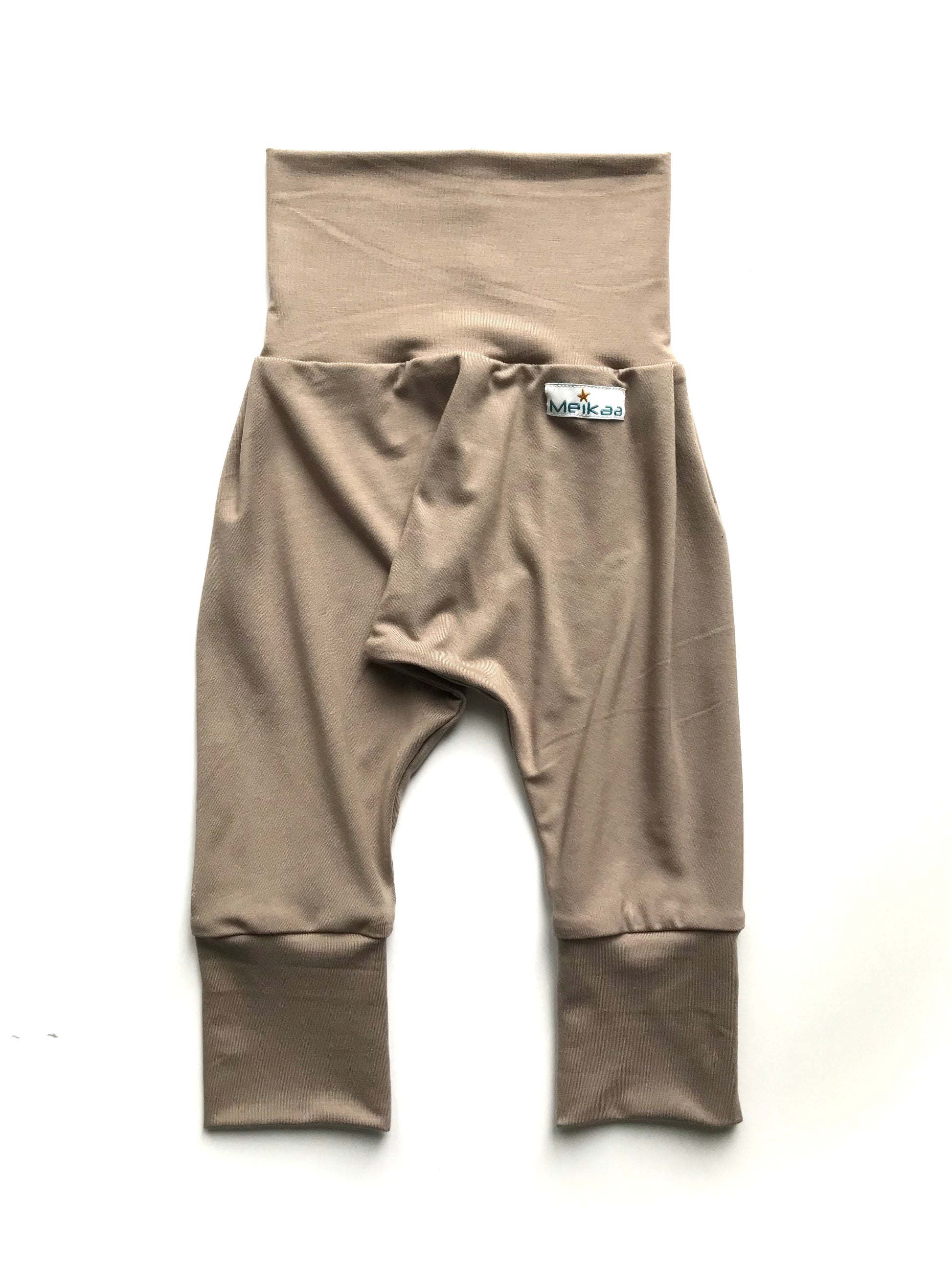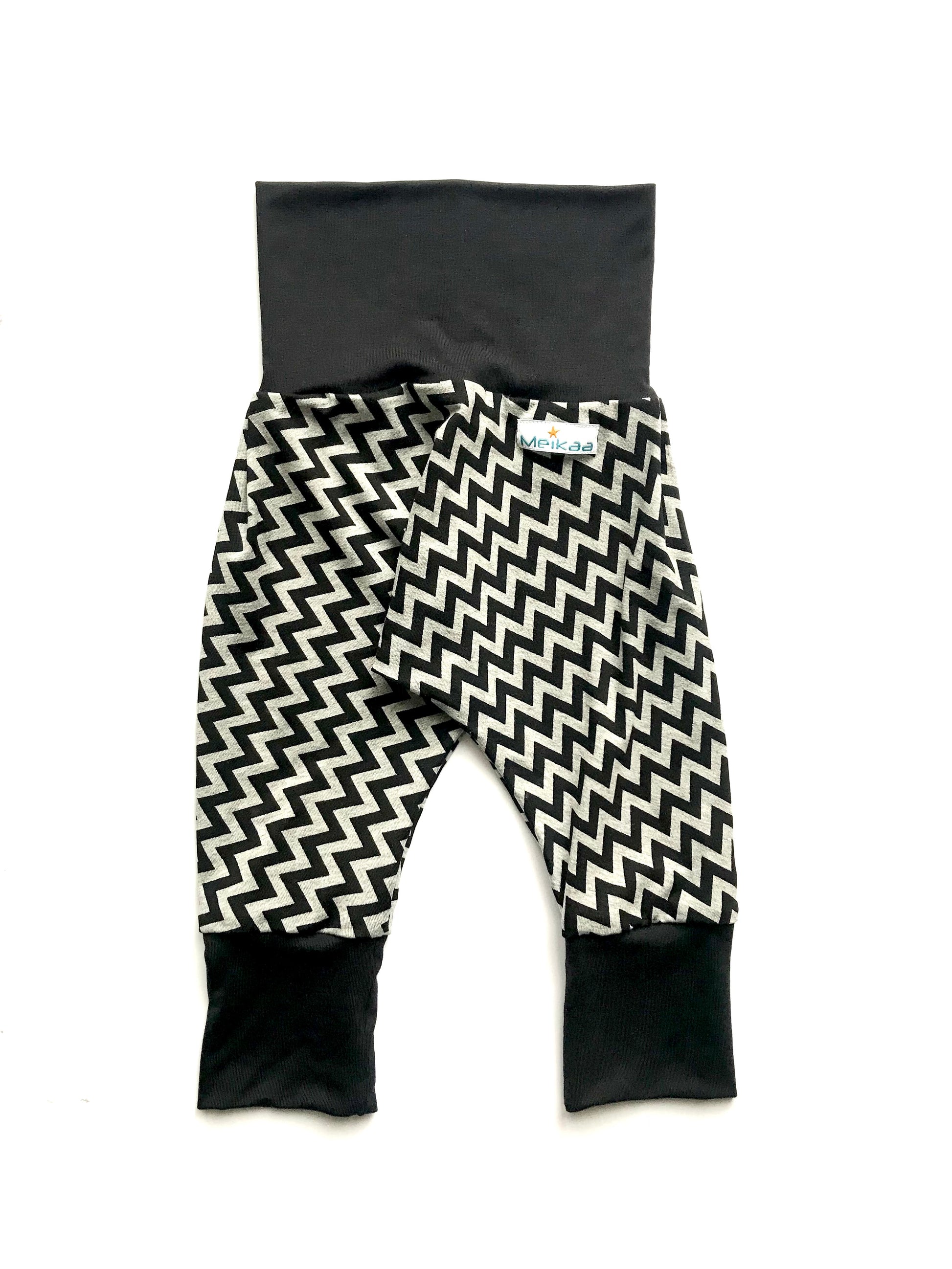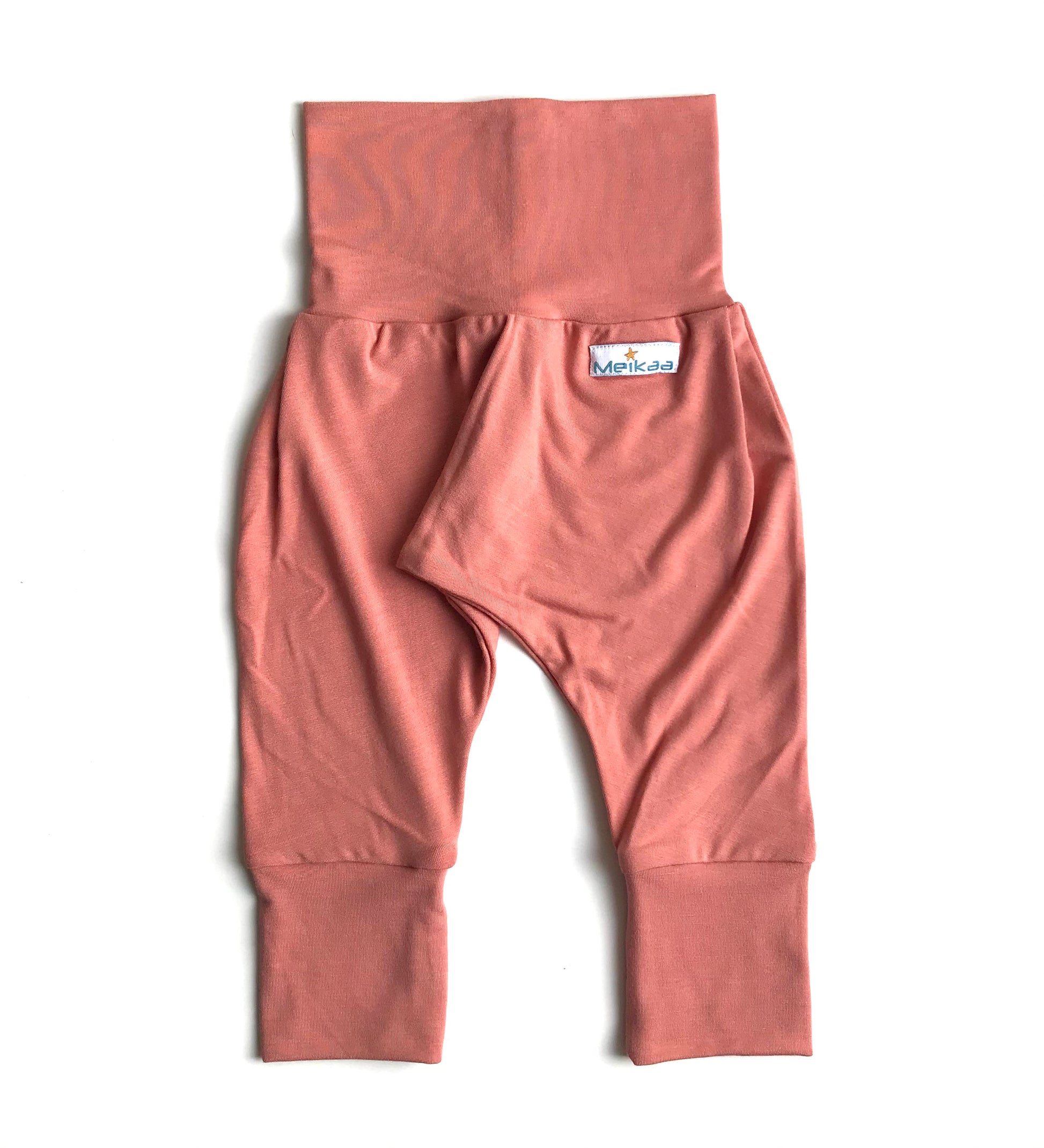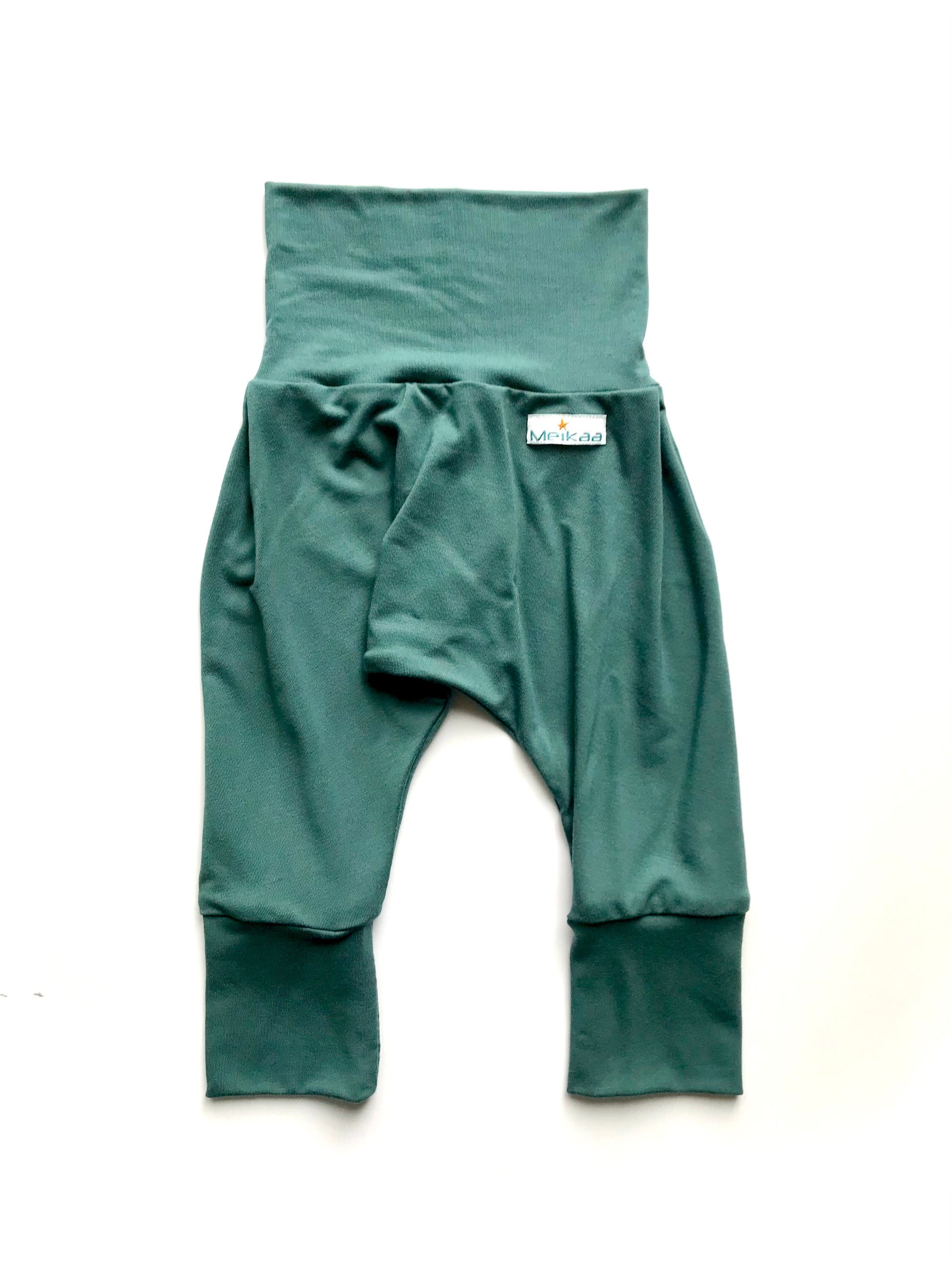 They are made to last longer. By folding and unfolding the waistband and ankle bands the pants will become 1 to 3 sizes smaller and bigger, depending on your needs. These harem pants will fit your baby with cloth diapers on or your kid with underwear.