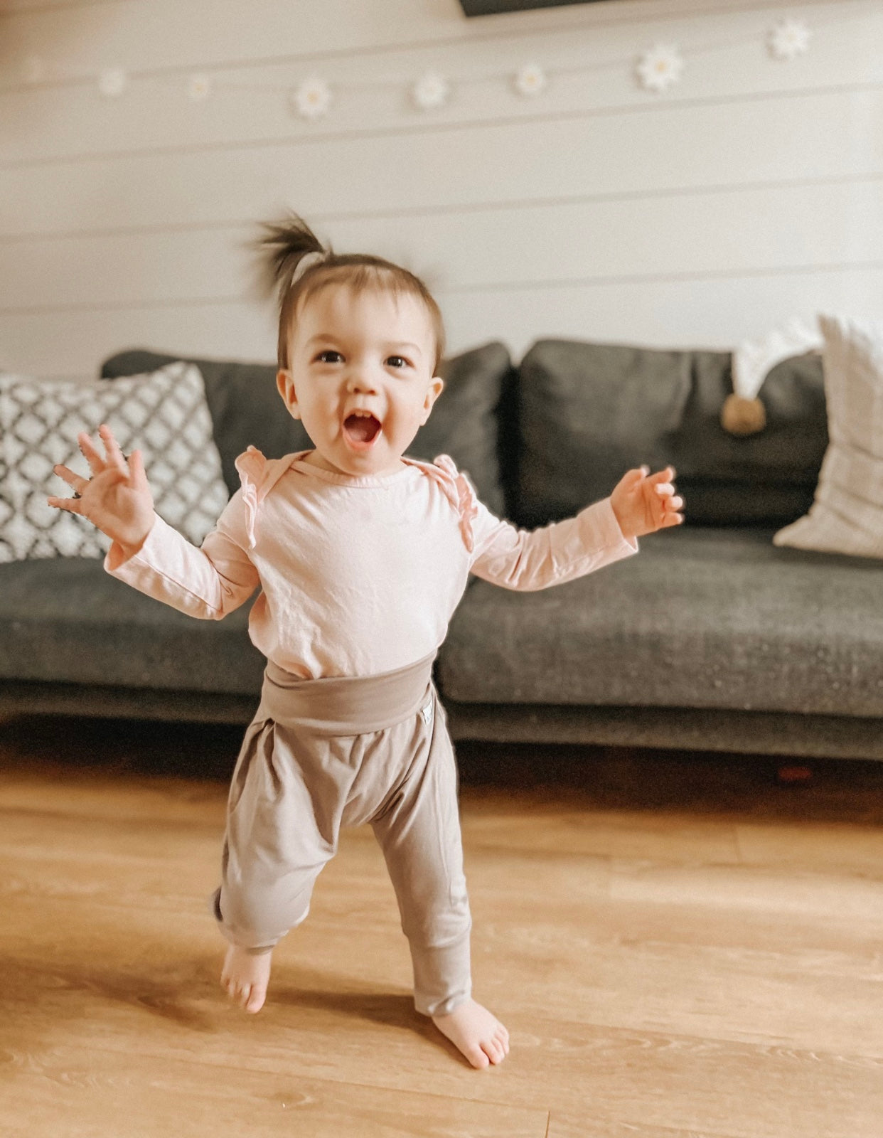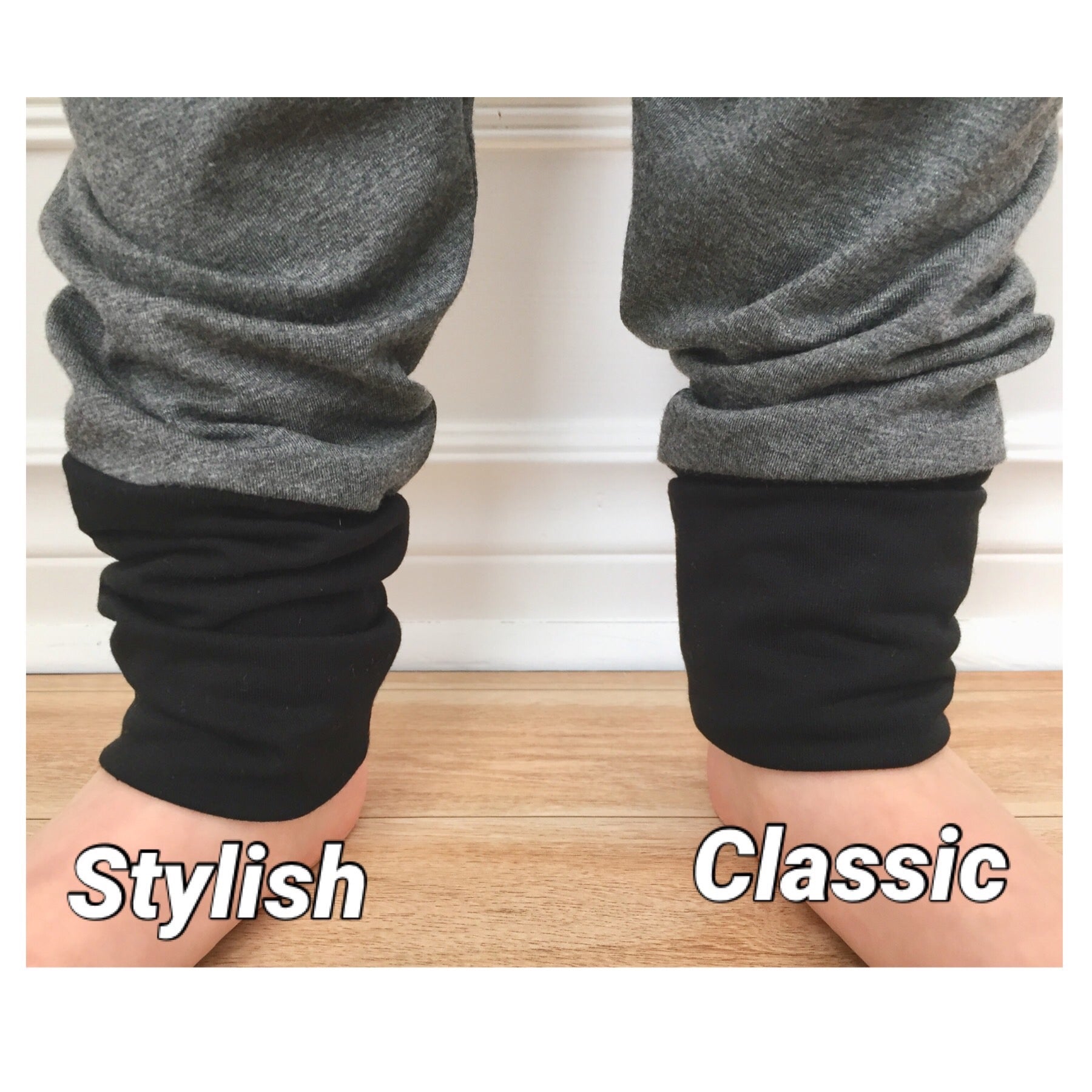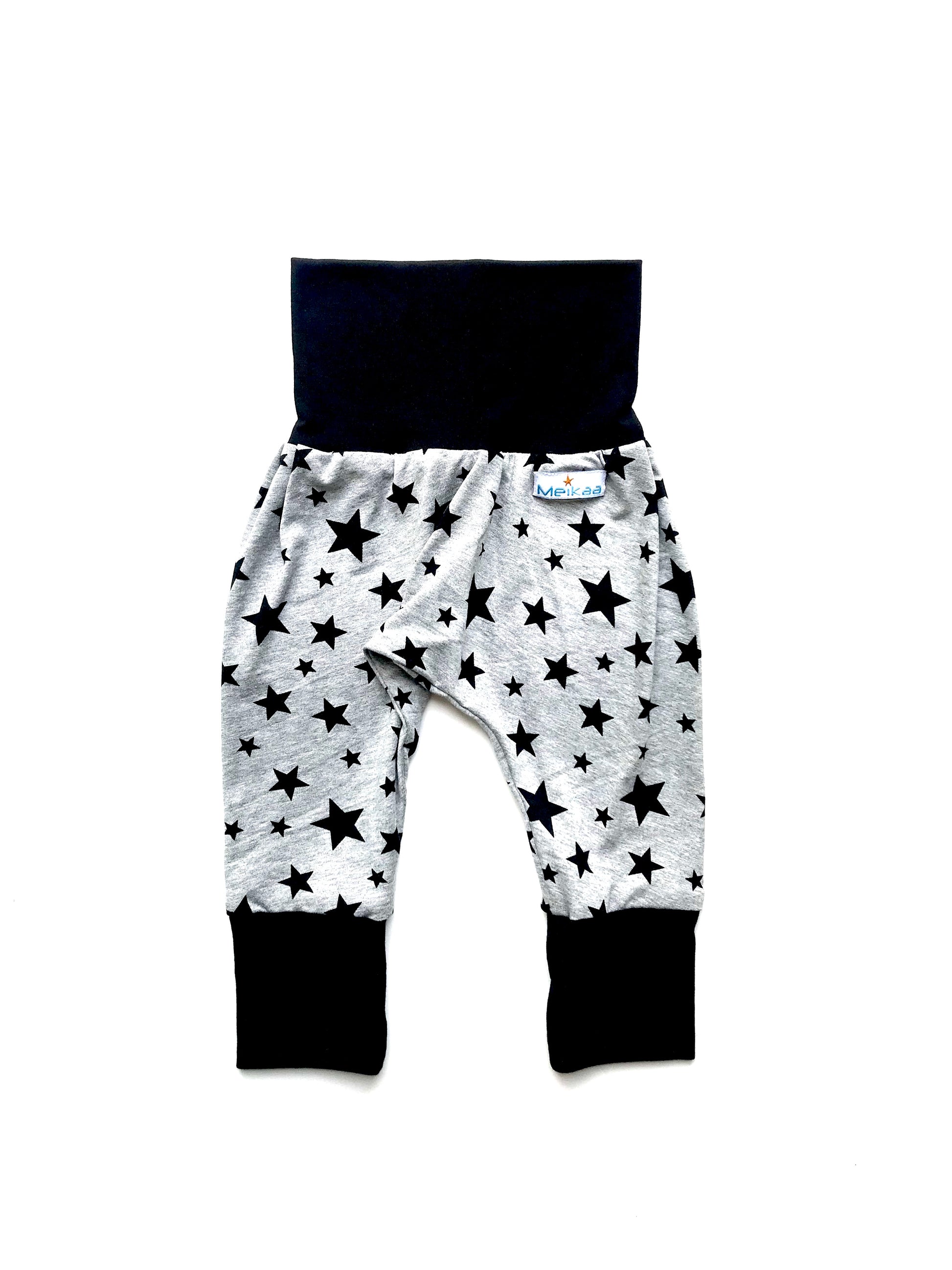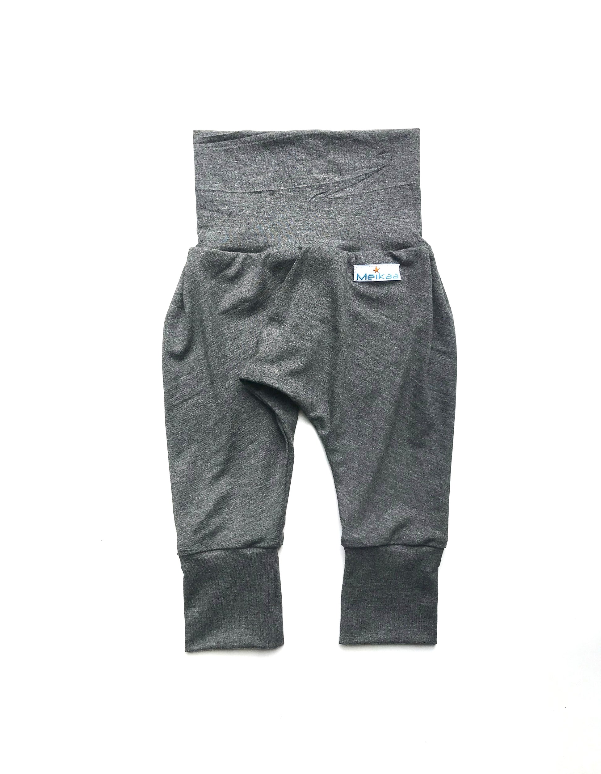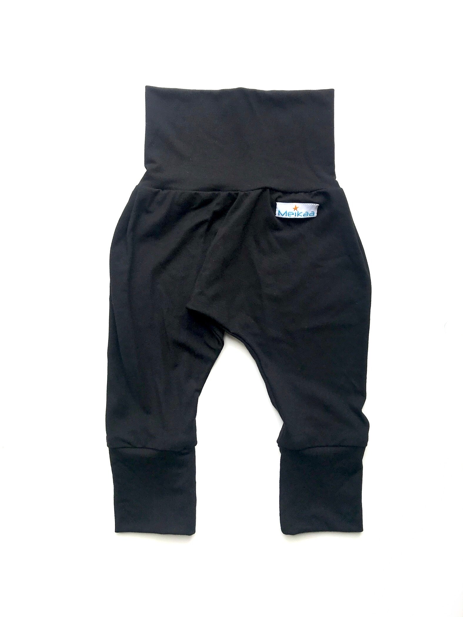 They are made to last longer. By folding and unfolding the waistband and ankle bands the pants will become 1 to 3 sizes smaller and bigger, depending on your needs. These harem pants will fit your baby with cloth diapers on or your kid with underwear.